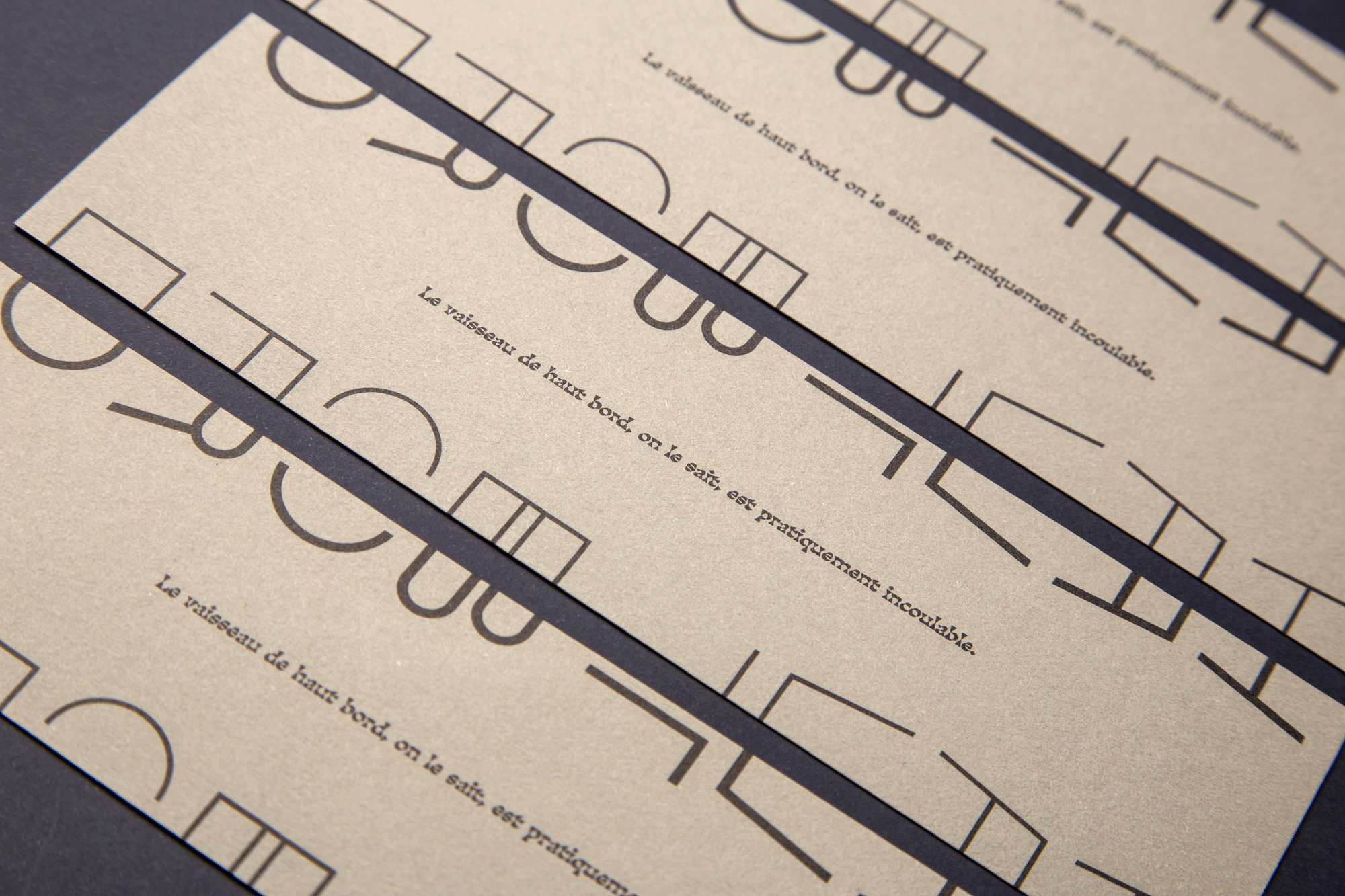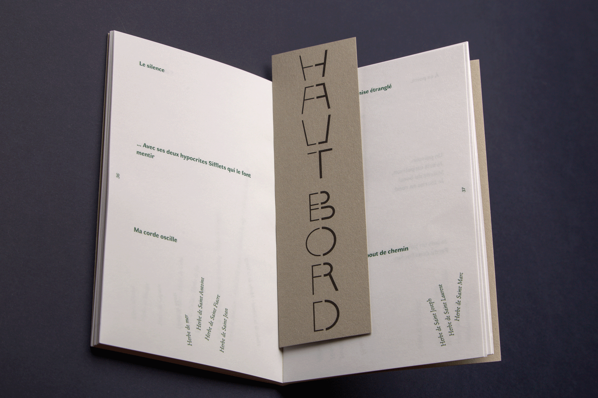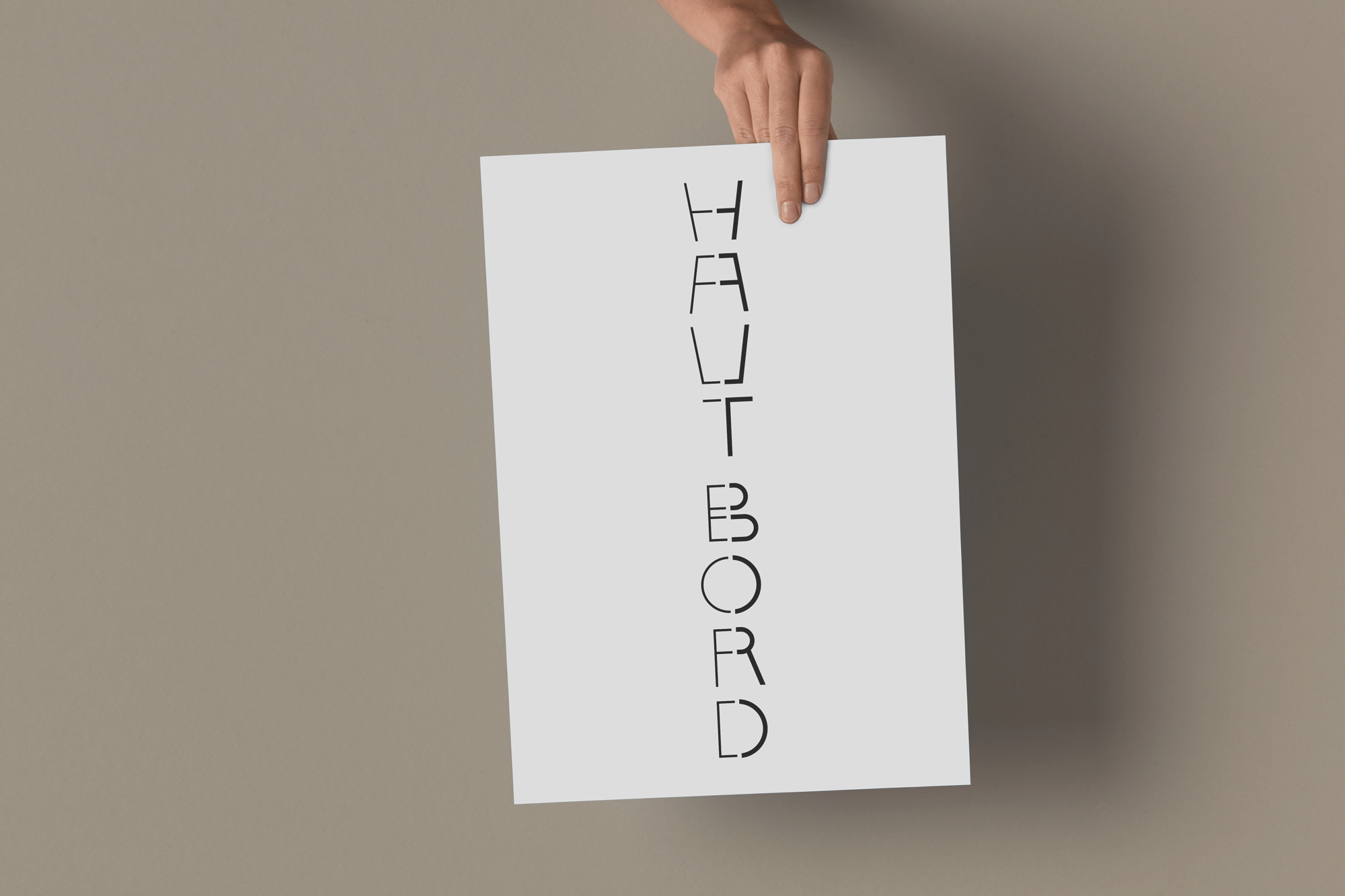 Maison d'édition publiant des textes insolites d'auteurs contemporains, Haut Bord inspire un logotype au format vertical, aux lettres symétriques. Son placement sur le bord d'un ouvrage permet une bascule sur 2 dimensions.