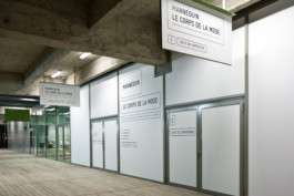Le traitement des éléments graphiques souligne l'esthétique clinique de cette exposition qui décortique la mode du point de vue du modèle. Les textes sont soulignés, encadrés, présentant les contenus sous forme d'étiquettes, posés sur les structures de présentation dans le prolongement des œuvres.