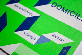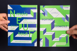 La narration se poursuit sur ce deuxième temps de chantier. Le ruban bleu se déploie comme un cheminement, annonçant la poursuite du prêt de documents durant la fermeture du bâtiment principal. Le vert fluo informe d'une rupture par rapport aux précédents supports. Les bandeaux deviennent supports de messages.