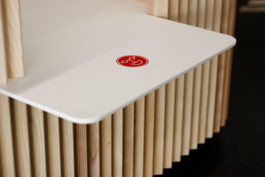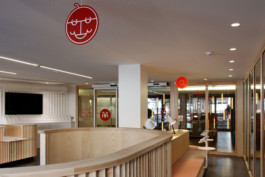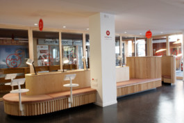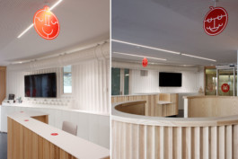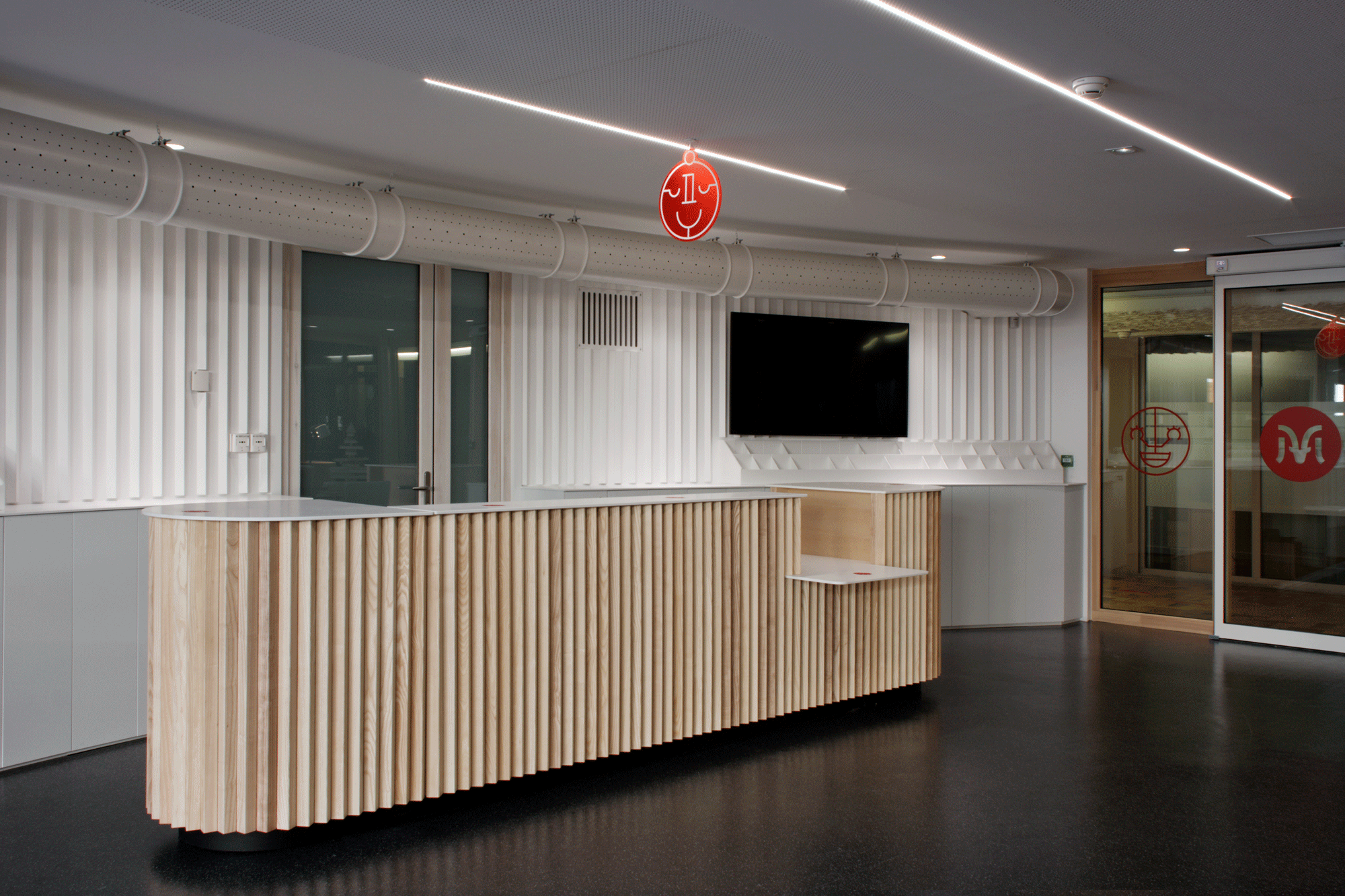 Pour accompagner les partis pris de ce projet de réhabilitation "bois-blanc-rouge", la signalétique est traitée en surfaces rouges qui se distinguent du mobilier aux lignes épurées.