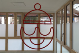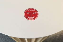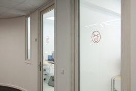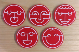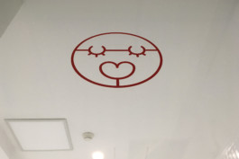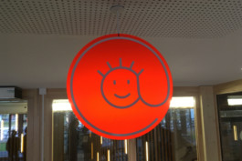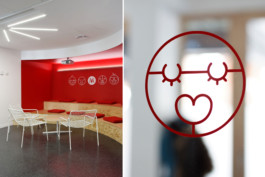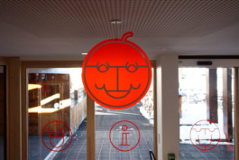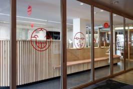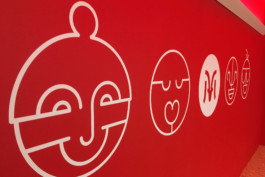Cette signalétique a été conçue en s'inspirant des postures d'accueil : "sourire jusqu'au oreilles", "accueillir la bouche en cœur"… Ici pas de texte, les différents espaces sont indiqués par des pictogrammes qui revisitent l'iconique smiley.