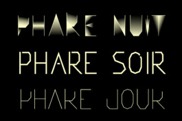 Initialement destinée à une réalisation en volume, Phare Nuit est composé de faisceaux lumineux dont les foyers sont placés stratégiquement: le tracé des lettres se fait par la lumière. La structure est altière, s’inspirant des proportions d’un phare, et facettée, comme la lentille de Fresnel. Sur cette base se déclinent les caractères Phare Jour et Phare Soir. Chacun revisite la structure de base en jouant sur l’apparition de la lettre: les fûts du Phare Jour sont incomplets, certaines traverses manquent… en échos à la présence lumineuse d’un phare en plein jour, éteint.